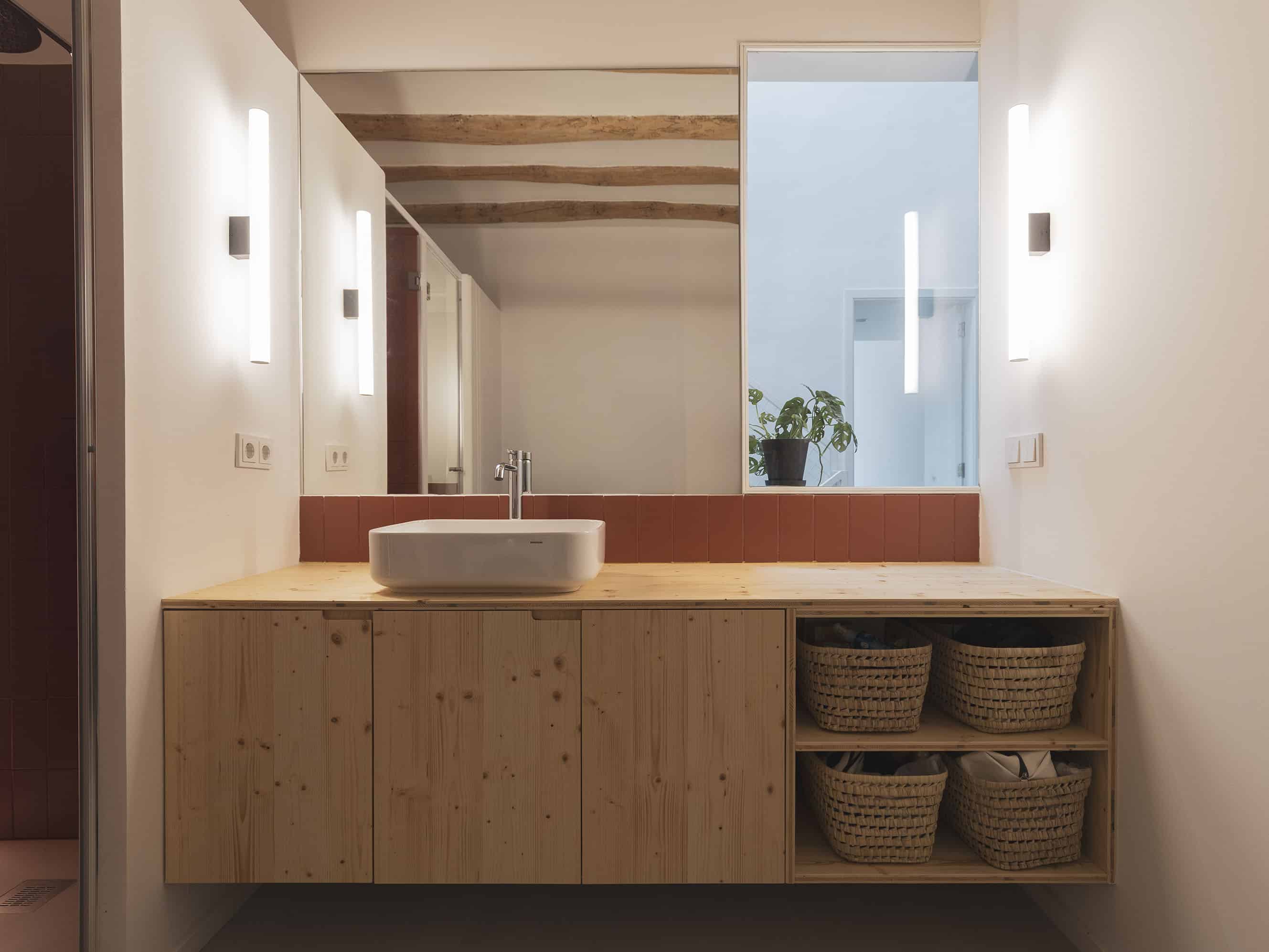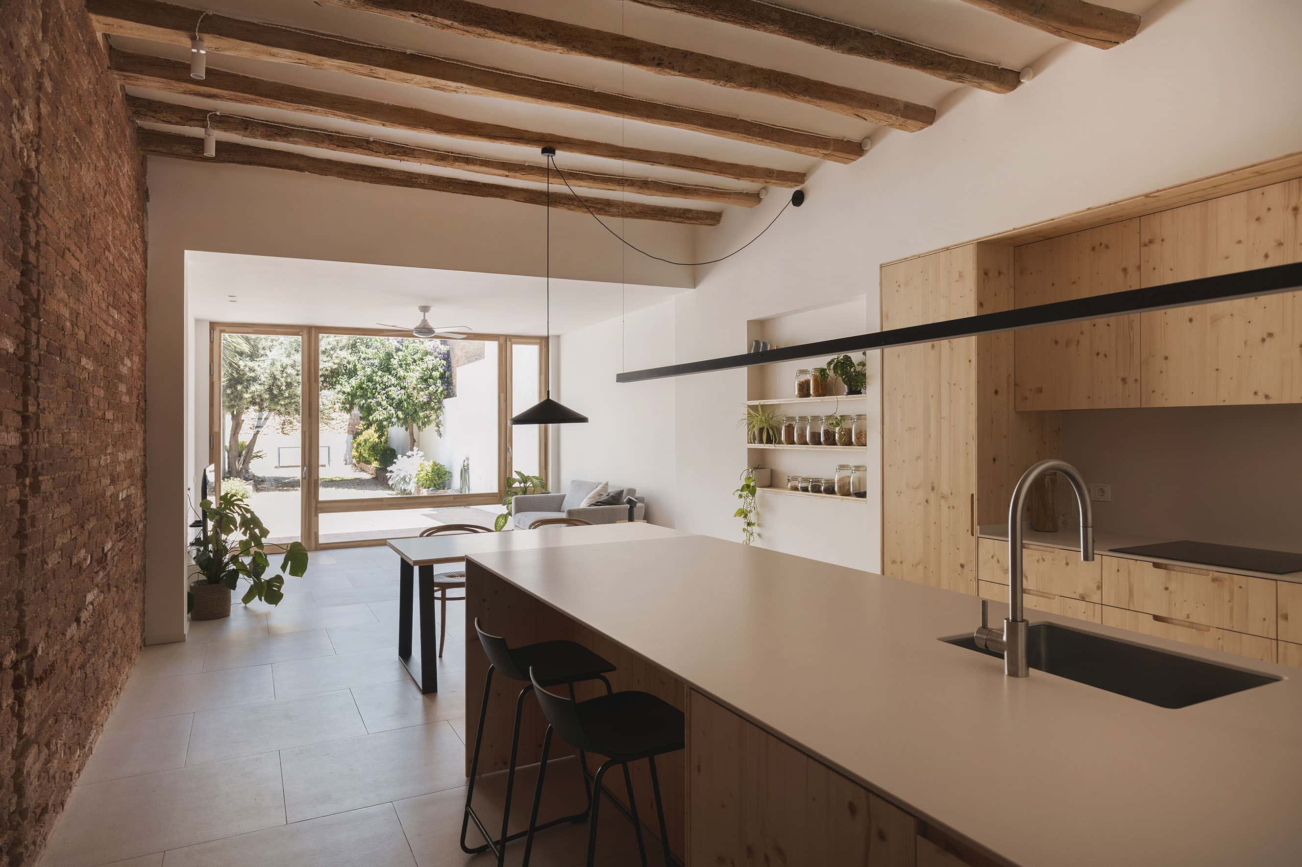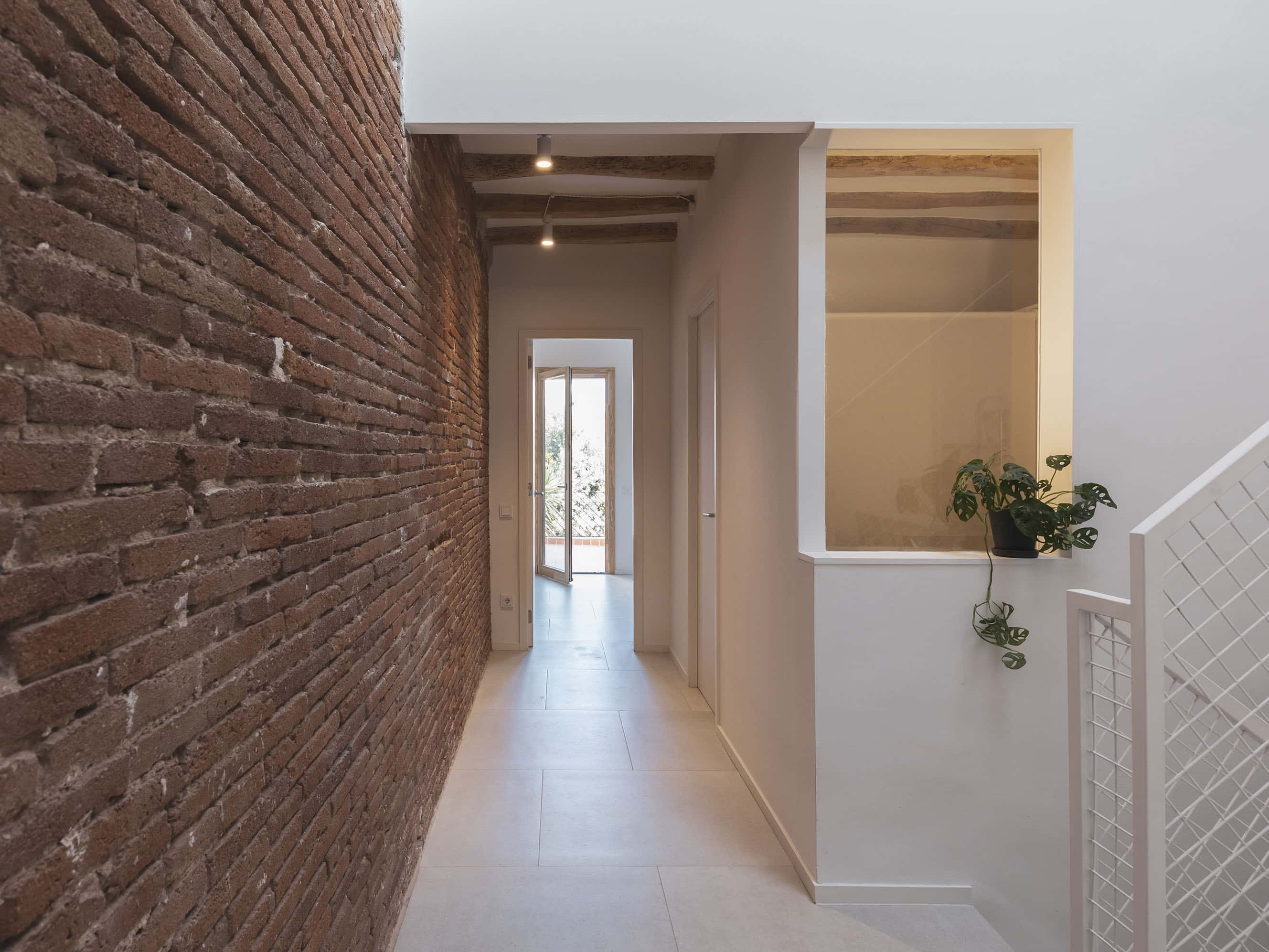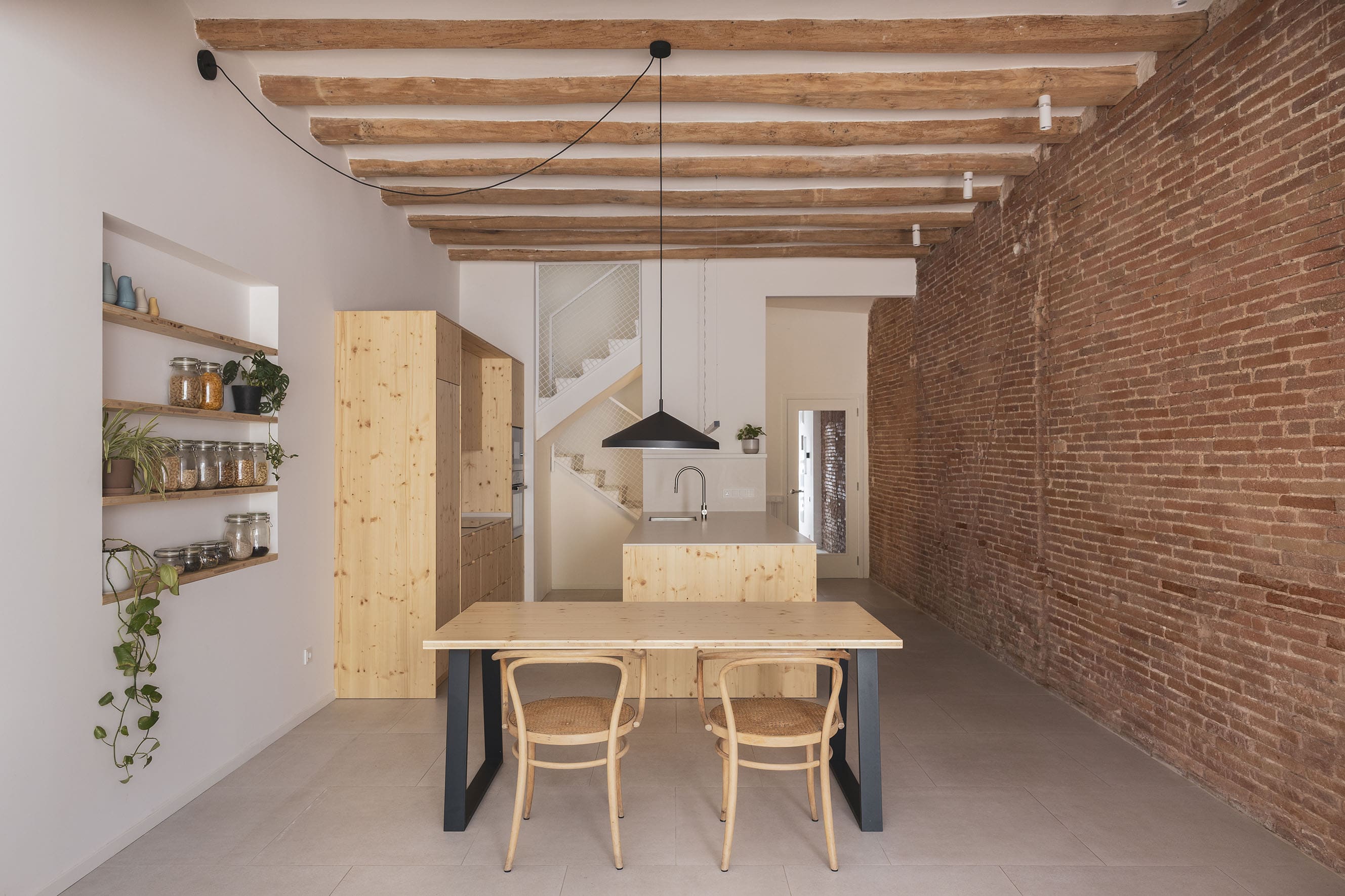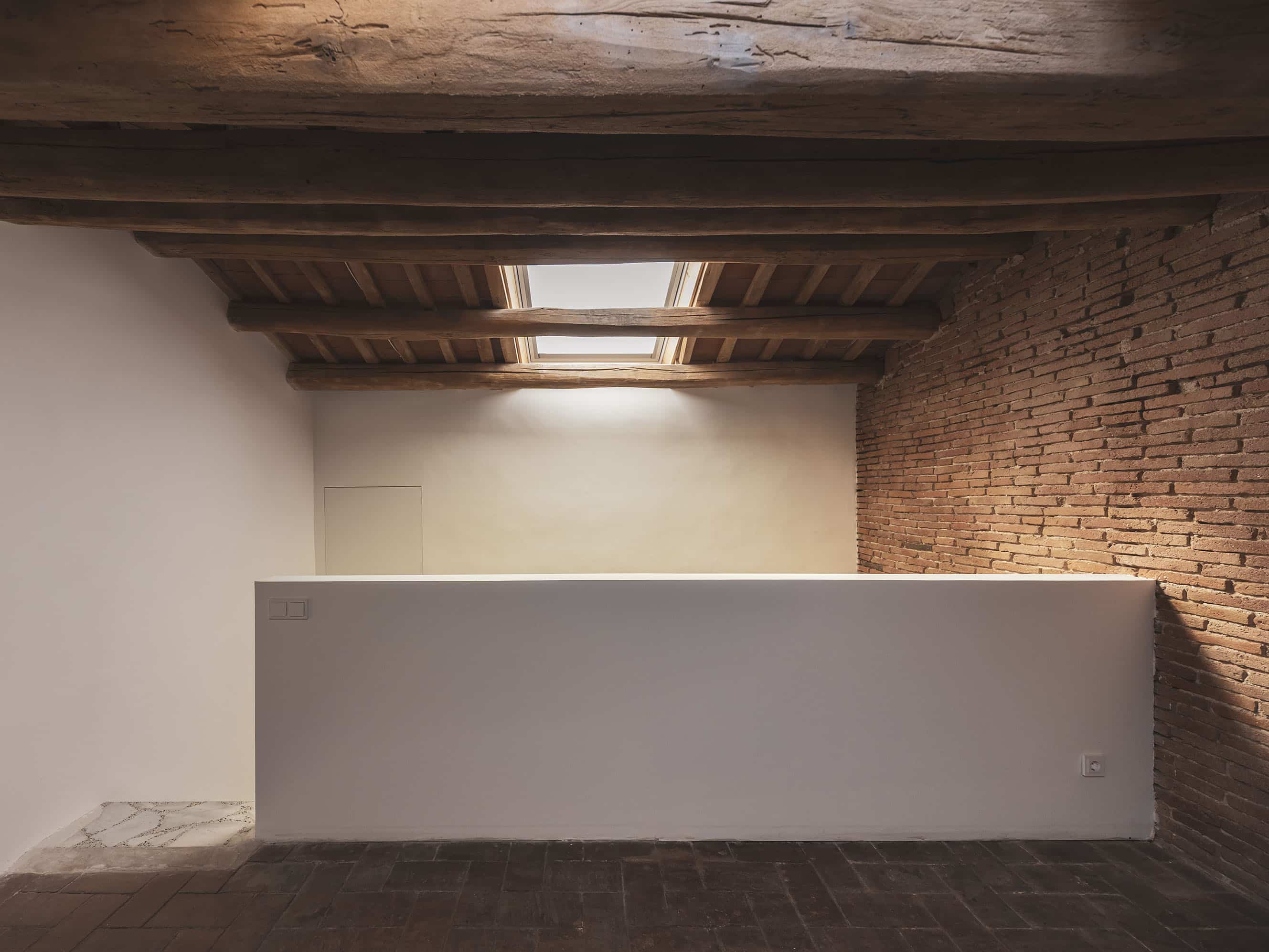 Reforma integral deixant a la vista l’anima de la construcció original. Parets de maó manual, bigues de fusta vista, mobles a mida de fuster i il·luminació acurada. Instal·lacions molt completes amb terra radiant i aire acondicionat per aerotèrmia combinat per amb les plaques fotovoltaiques.
