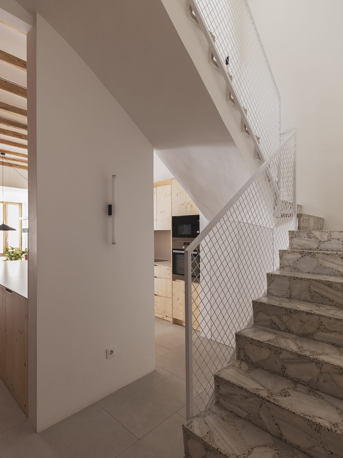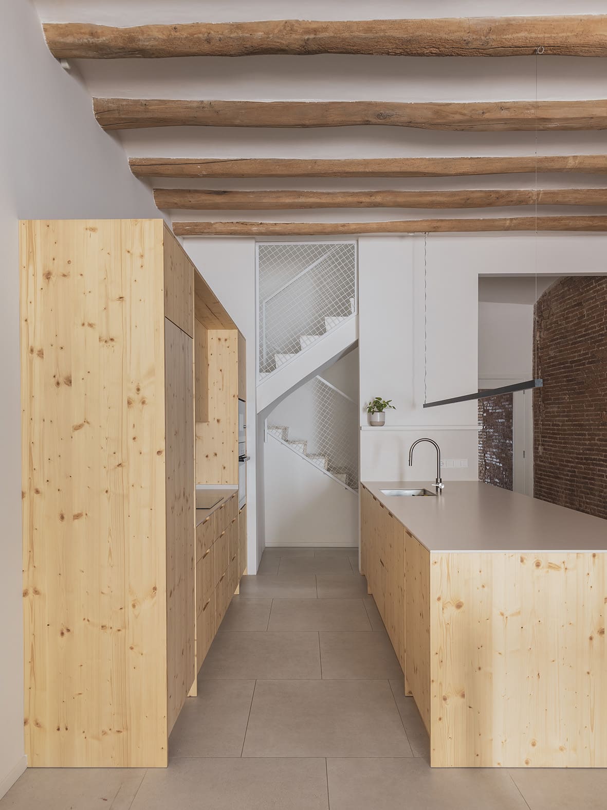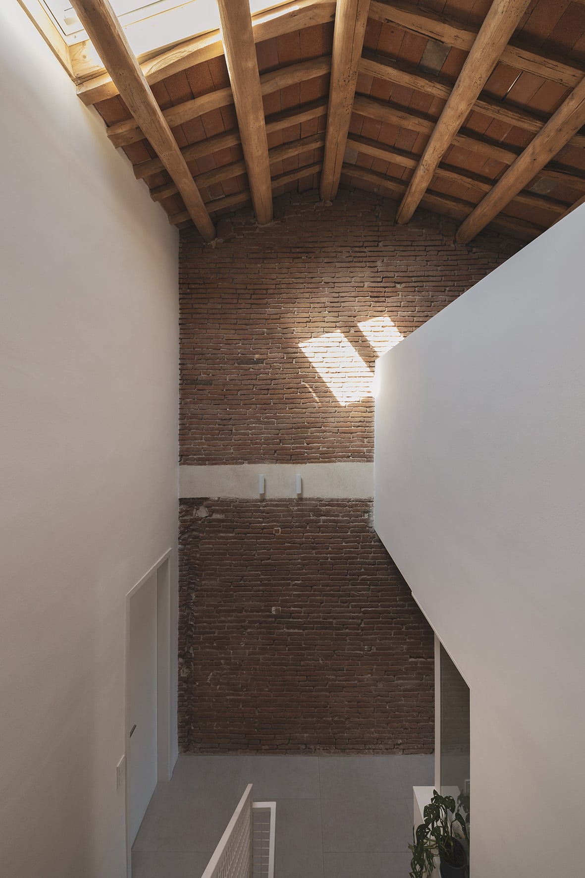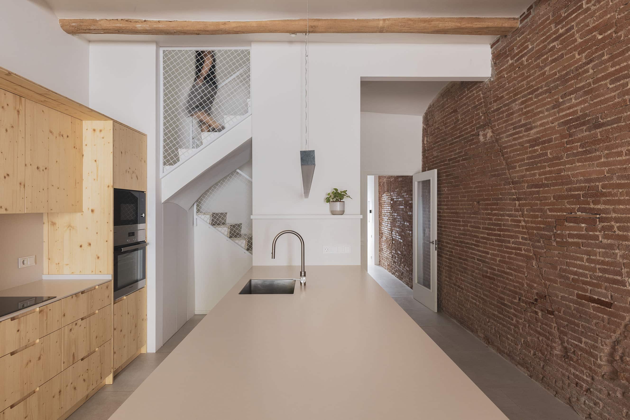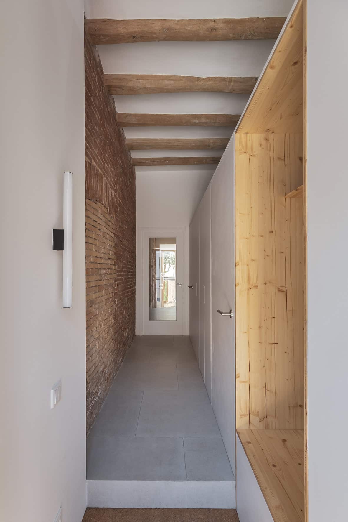 Reforma integral deixant a la vista l’anima de la construcció original. Parets de maó manual, bigues de fusta vista, mobles a mida de fuster i il·luminació acurada. Instal·lacions molt completes amb terra radiant i aire acondicionat per aerotèrmia combinat per amb les plaques fotovoltaiques.