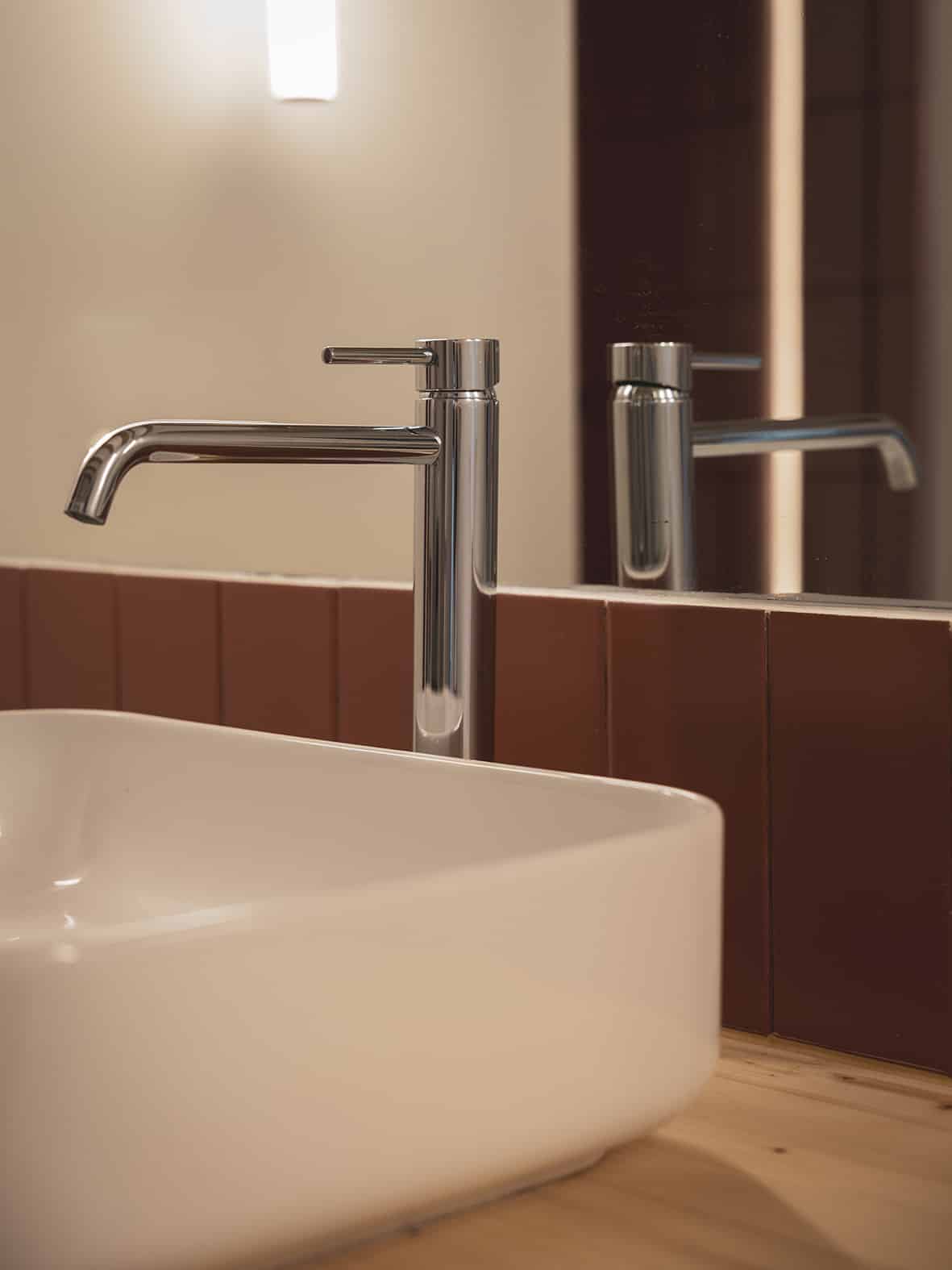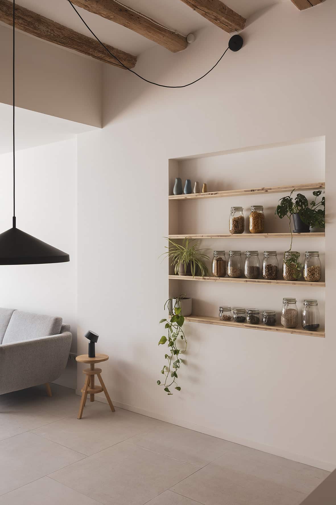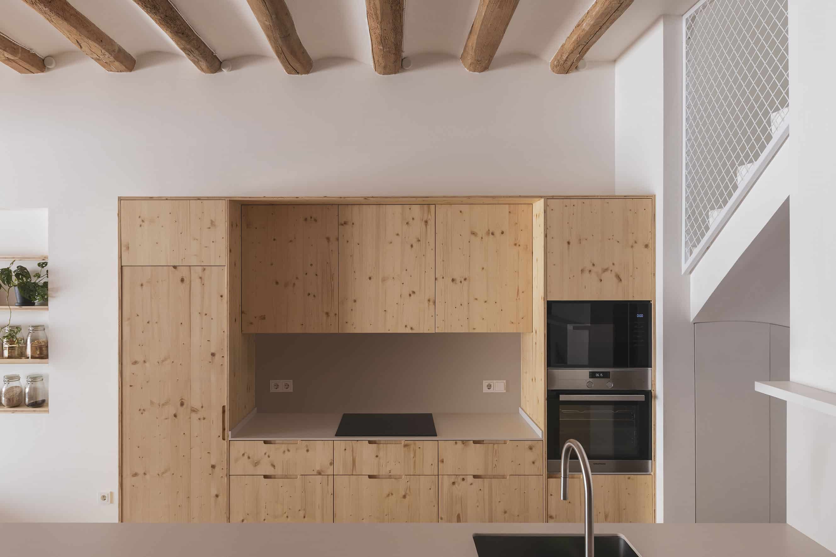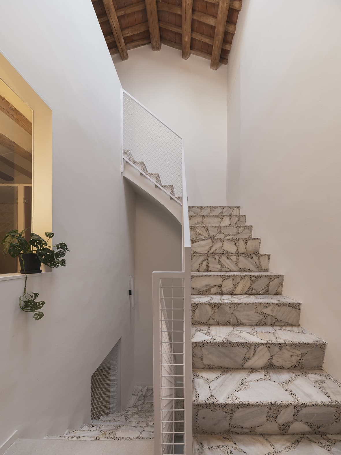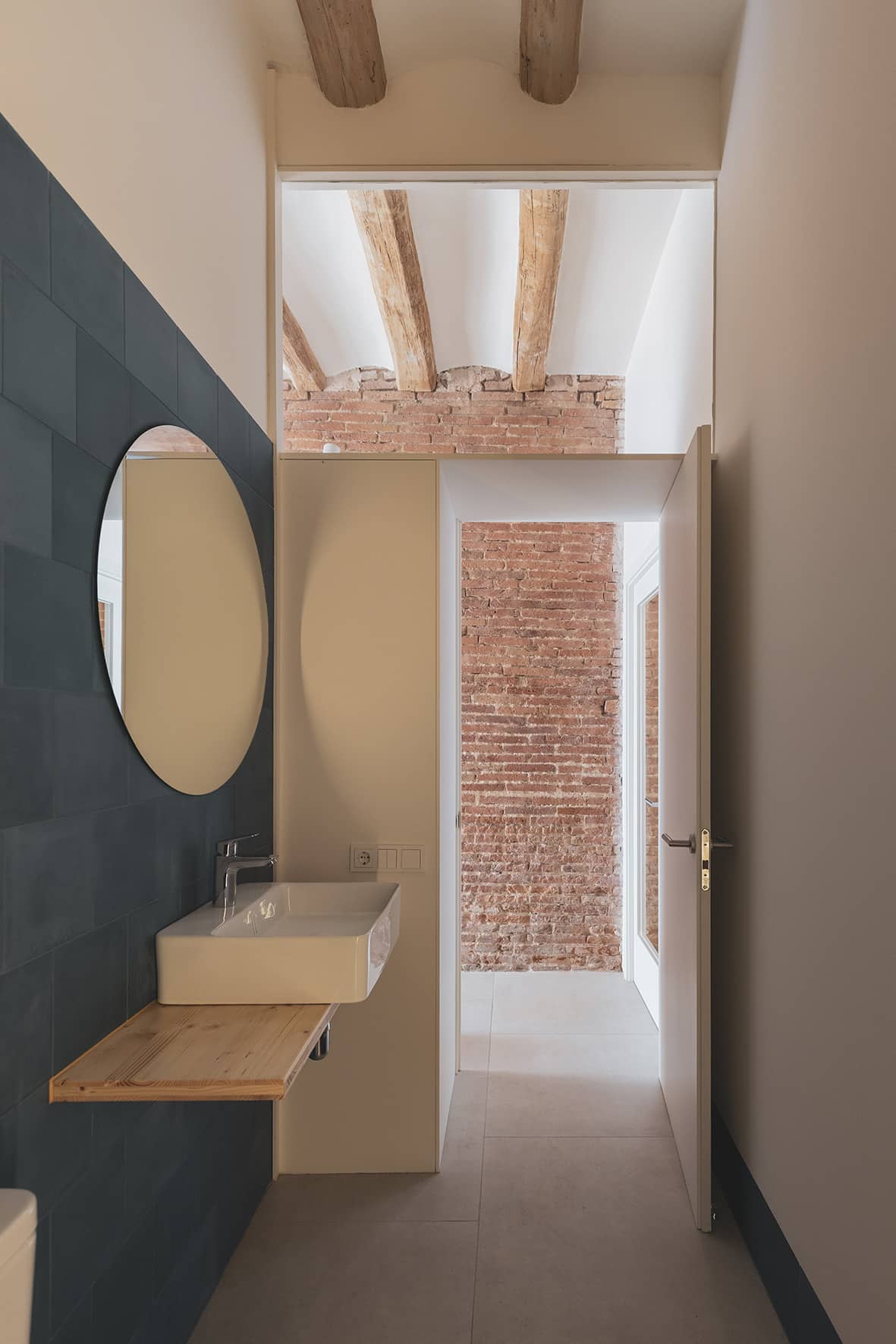 Reforma integral deixant a la vista l’anima de la construcció original. Parets de maó manual, bigues de fusta vista, mobles a mida de fuster i il·luminació acurada. Instal·lacions molt completes amb terra radiant i aire acondicionat per aerotèrmia combinat per amb les plaques fotovoltaiques.